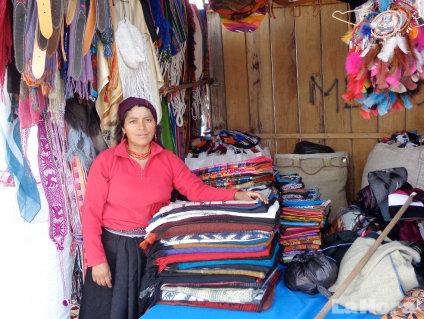 Alrededor de la plaza cuelgan tapices que representan personas, animales andinos, escenas cotidianas y paisajes como montañas, el sol y la luna. Estos tapices están hechos de lana de borrego, material que aporta elasticidad y resistencia, teñido con pigmentos naturales de semillas y hojas.